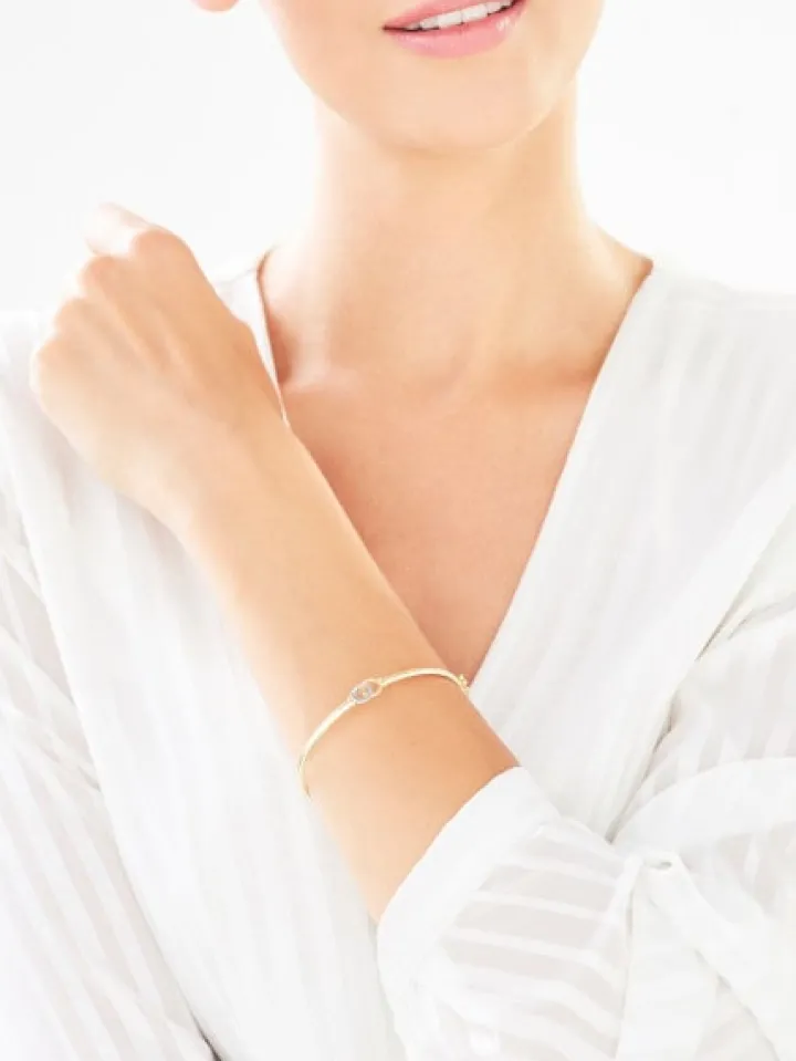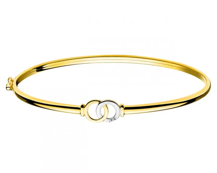 Połyskująca diamentem sztywna bransoletka z żółtego złota. Delikatny motyw dekoracyjny w złotej bransoletce tworzą dwa przenikające się kółka, z których jedno rozświetla blask diamentu. Idealny wzór dla zwolenniczek minimalistycznych form w biżuterii i diamentowych refleksów.