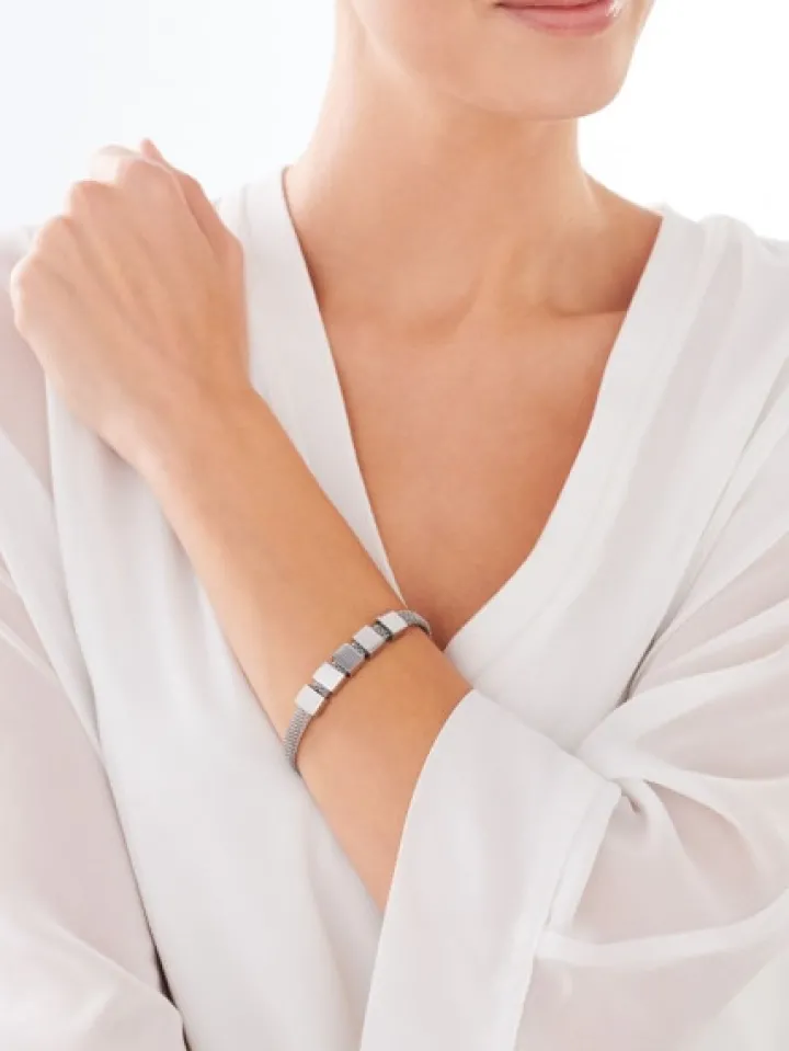 Miękko układająca się bransoletka łączonych łańcuszków ze stali szlachetnej. Ich delikatną, regularną strukturę przełamano kompozycją geometrycznych zawieszek o gładkich powierzchniach. Minimalistyczna bransoletka współgra z naszyjnikiem z kolekcji Elixa.