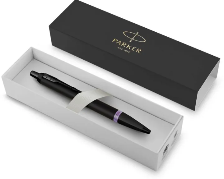 Długopis Parker IM Vibrant Rings | satynowy czarny lakier z akcentami w odcieniu fioletowego ametystu | końcówka medium z wkładem z niebieskim atramentem | opakowanie prezentowe