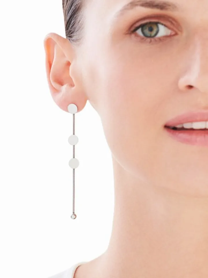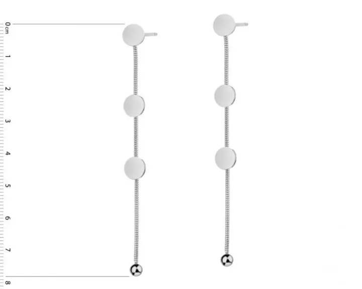 Wiszące kolczyki ze stali szlachetnej. Smukłą formę kolczyki zawdzięczają łańcuszkom o wyrazistym, regularnym splocie, które skomponowano z modnymi w biżuterii motywami – kulką oraz delikatnymi zawieszkami w kształcie kółek. Bardzo efektowne kolczyki dla kobiet, które cenią wyraziste dodatki. Wzór występuje także w wersji wykonanej ze stali szlachetnej w kolorze złota.
