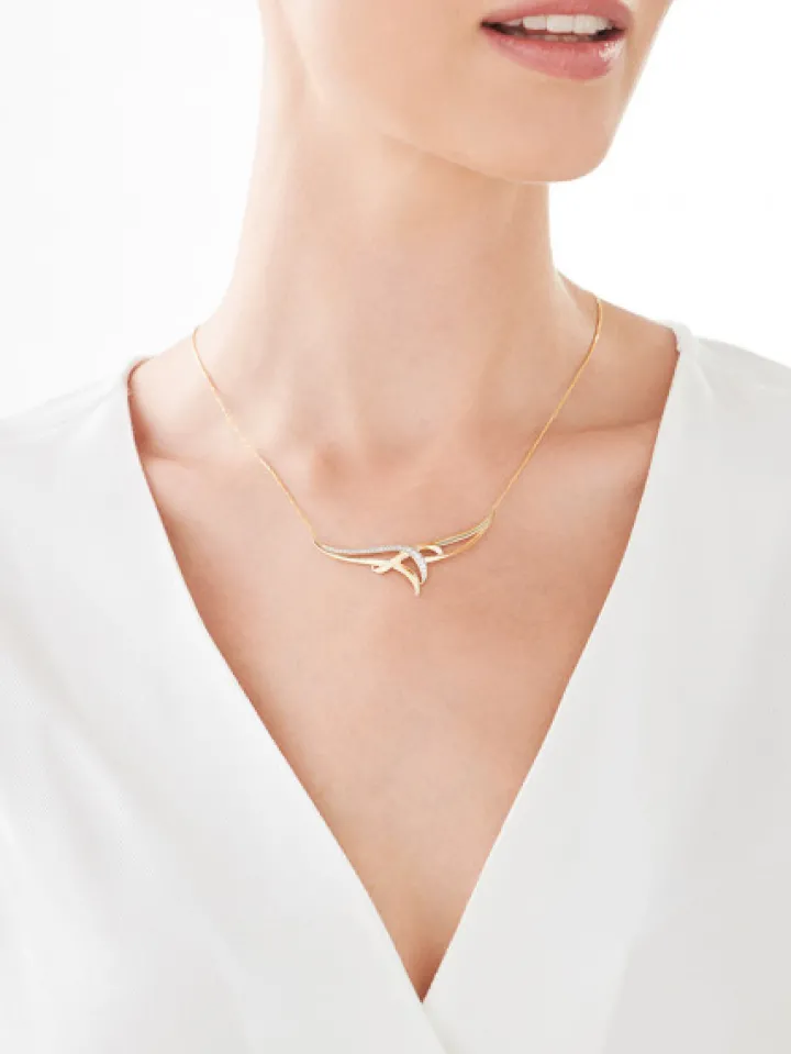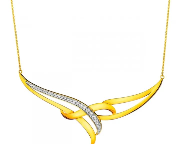Wyrafinowany naszyjnik z żółtego złota z wysmakowaną zawieszką, lśniącą aż 27 brylantami. Kompozycja szlachetnych kamieni doskonale współgra z łagodnymi, układającymi się w ażurowy deseń liniami dekoracyjnej zawieszki. Naszyjnik idealnie będzie korespondował z każdą stylizacją, a szczególnie z tymi na wyjątkowe okazje.