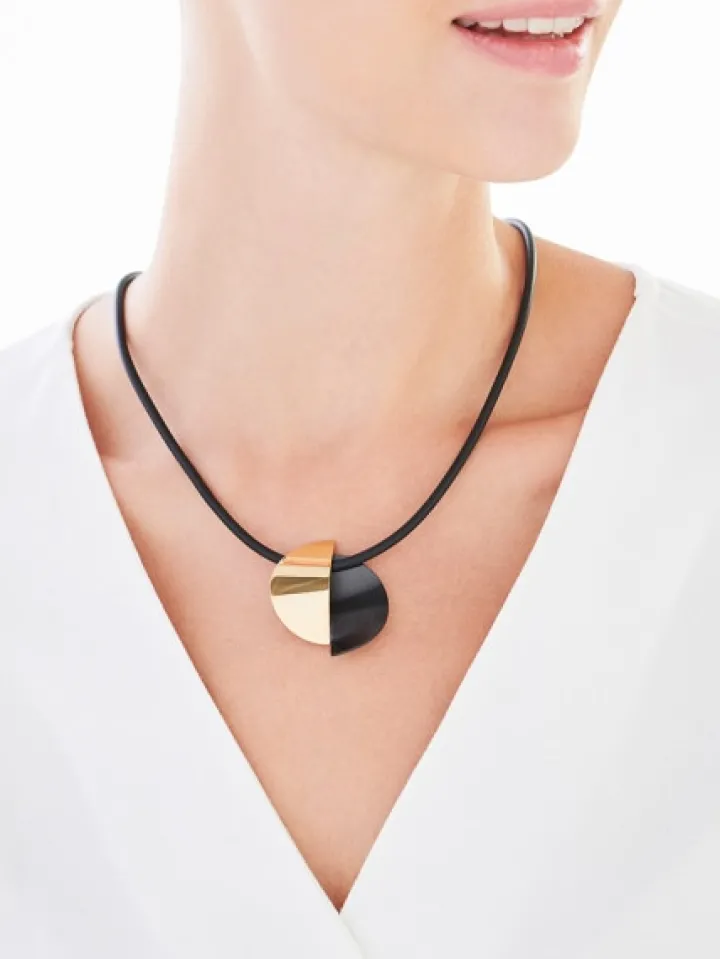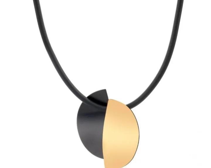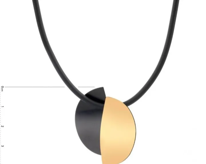 Przykuwający uwagę wyrazistą estetyką naszyjnik ze stali szlachetnej. Połączenie barw złota i czerni podkreśla nietuzinkową, ekspresyjną zawieszkę naszyjnika. Naszyjnik, a także pasujące do niego kolczyki to biżuteria w awangardowym stylu, idealna dla kobiet poszukujących intensywnego designu w biżuteryjnych dodatkach.