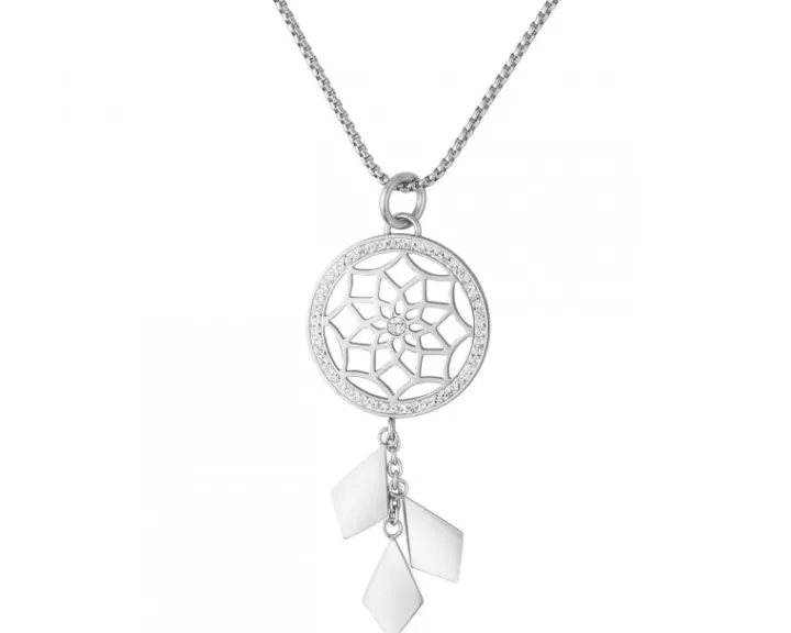 Ozdobiony cieszącym się popularnością łapaczem snów naszyjnik ze stali szlachetnej. Ażurową zawieszkę naszyjnika, nawiązującą formą do indiańskiego amuletu, ozdobiono kompozycją kryształów, które podkreślają finezję tego elementu dekoracyjnego. Z fantazyjnym naszyjnikiem współgrają pasujące do kompletu kolczyki z kolekcji.
