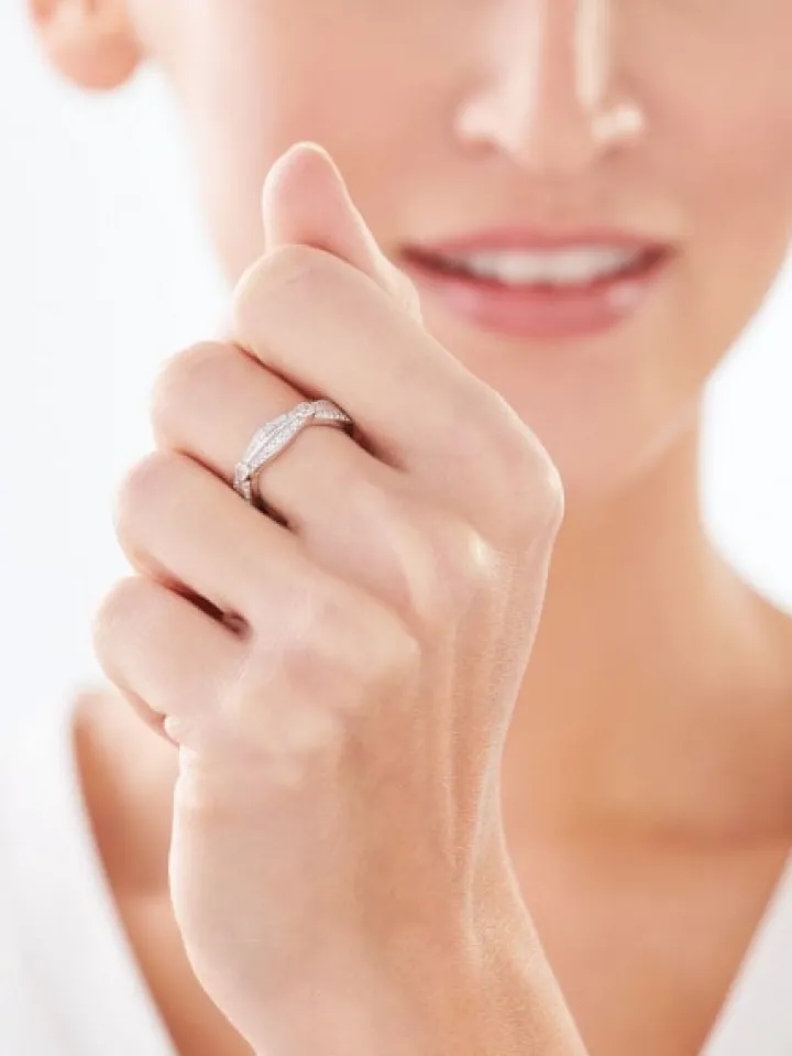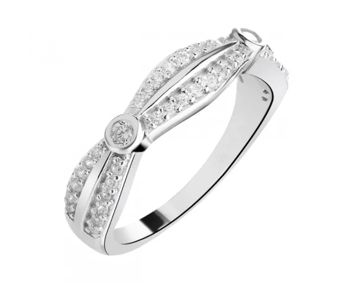 Srebrny pierścionek ozdobiony kompozycją oryginalnych detali, które tworzą nietuzinkowy motyw dekoracyjny. Niebanalny charakter pierścionka zaskakująco łączy się z blaskiem białych cyrkonii, którymi podkreślono jego srebrne elementy.