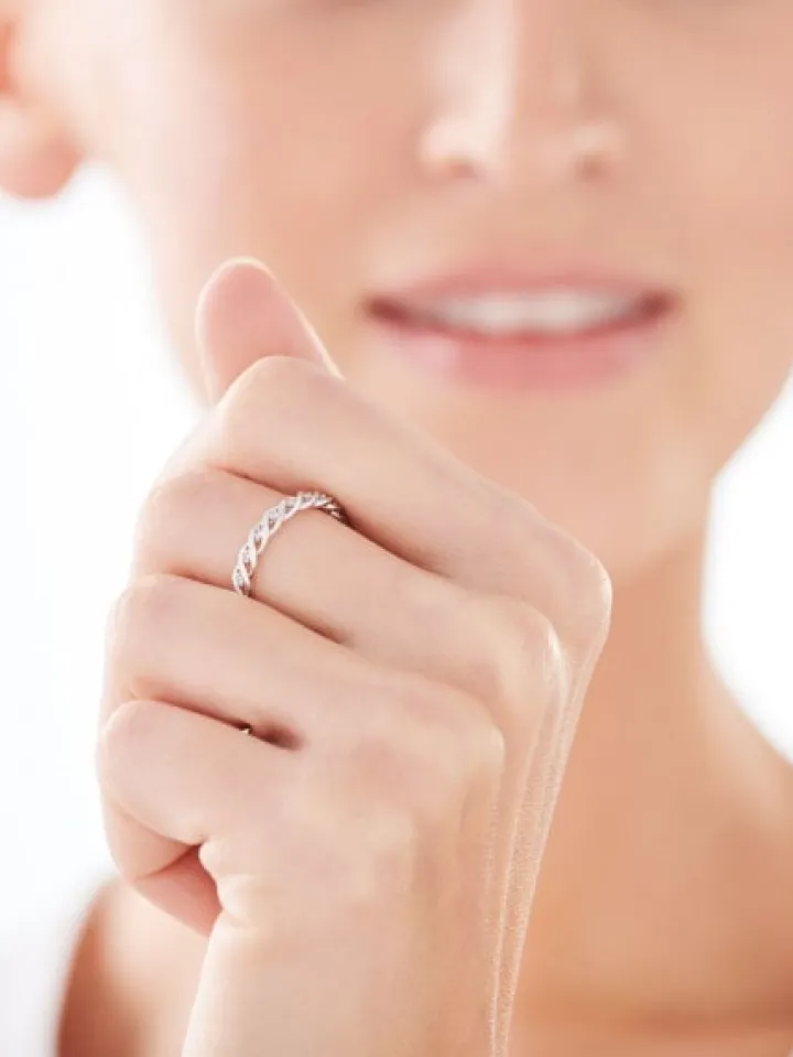 Srebrny pierścionek w kształcie obrączki o strukturze delikatnego splotu. Ażurową, dekoracyjną formę pierścionka ozdobiono regularną kompozycją połyskujących białych cyrkonii. Wzór można nosić jako samodzielny dodatek lub zakładać jednocześnie z innymi wzorami.