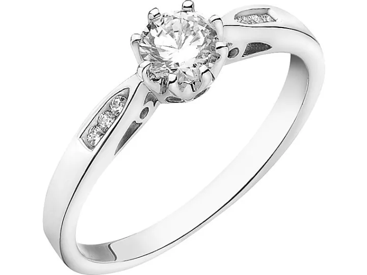 Zniewalający blaskiem pierścionek ze srebra. Klasyczna forma pierścionka wspaniale komponuje się z intensywnym lśnieniem kompozycji białych cyrkonii, z których centralną oprawiono w osiem krap. Mniejsze kamienie subtelnie zdobią szynę tego eleganckiego, romantycznego wzoru.