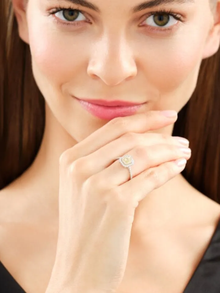 - Diament żółty – Kształt/Szlif: Brylant, 14 szt. o łącznej masie 0,13 ct, Czystość / Barwa: SI2/S-Z,