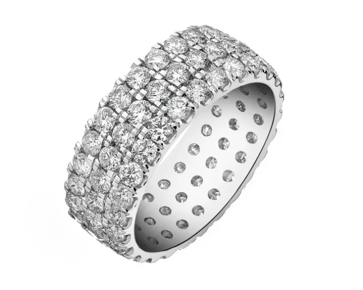 Złoty pierścionek z brylantami Eternity, wykonany z 18-karatowego białego złota to esencja wyrafinowanego luksusu i elegancji. Bogato zdobiony 78 diamentami o łącznej masie 2,75 ct pierścionek zachwyca swoim klasycznym, a zarazem ponadczasowym designem. Diamenty zostały misternie osadzone w trzech rzędach wokół całego obwodu pierścionka, tworząc nieprzerwaną linię blasku, która symbolizuje wieczność i trwałość, czyniąc go idealnym wyborem na zaręczyny, rocznice lub inne wyjątkowe momenty.
