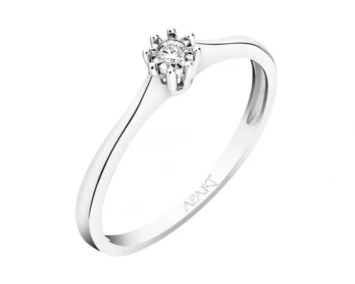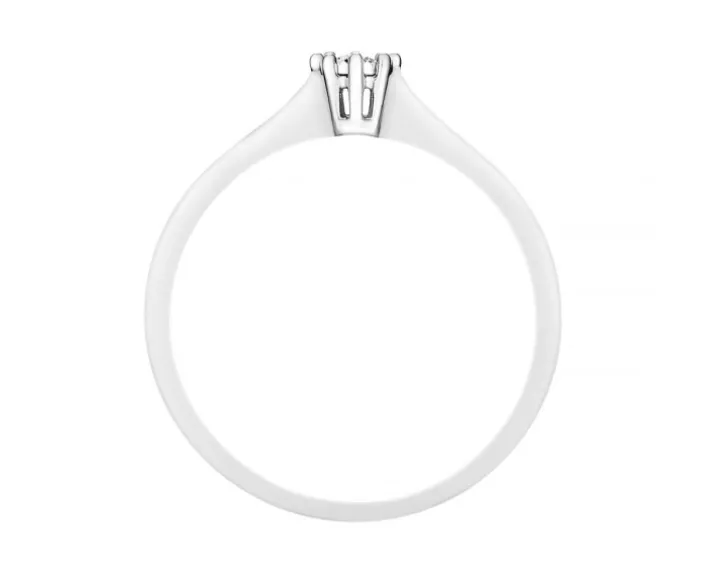 Klasyczny złoty pierścionek zaręczynowy w białymzłocie z brylantem. Brylant w oprawie ośmiu krap jest stabilnie przytrzymywanyi jednocześnie intensywnie połyskuje. Pierścionek z brylantem zawsze doskonalekoresponduje z romantycznym charakterem wydarzenia, jakim sązaręczyny.