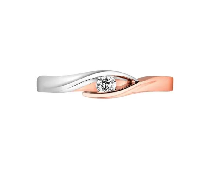 Chwila zaręczyn przypieczętowana diamentowym blaskiem. Brylant w linearnych, delikatnie otwartych objęciach subtelnej szyny pierścionka zaręczynowego z różowego złota, płynnie przechodzącego w białe. Zaproponowana, wymykająca się klasyce forma, pozwala w pełni podziwiać kamień i misterną kompozycję jego szlifów.