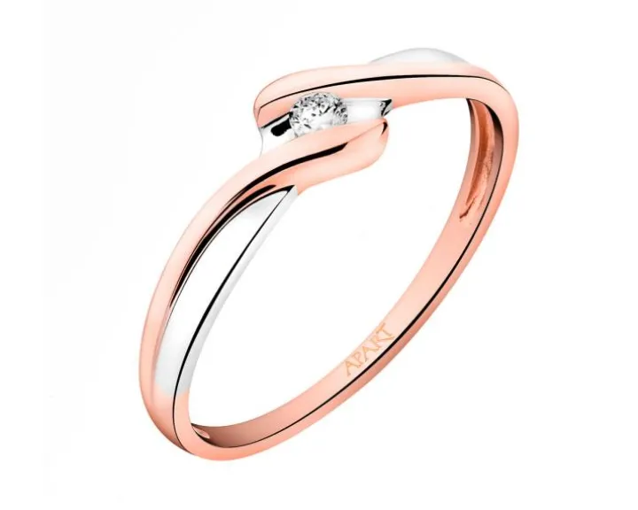 Chwila zaręczyn przypieczętowana diamentowym blaskiem. Pierścionek zaręczynowy, w którym subtelna linia szyny z różowego i białego złota, otacza asymetryczną kompozycją czyste piękno szlachetnego diamentu o brylantowym szlifie.
