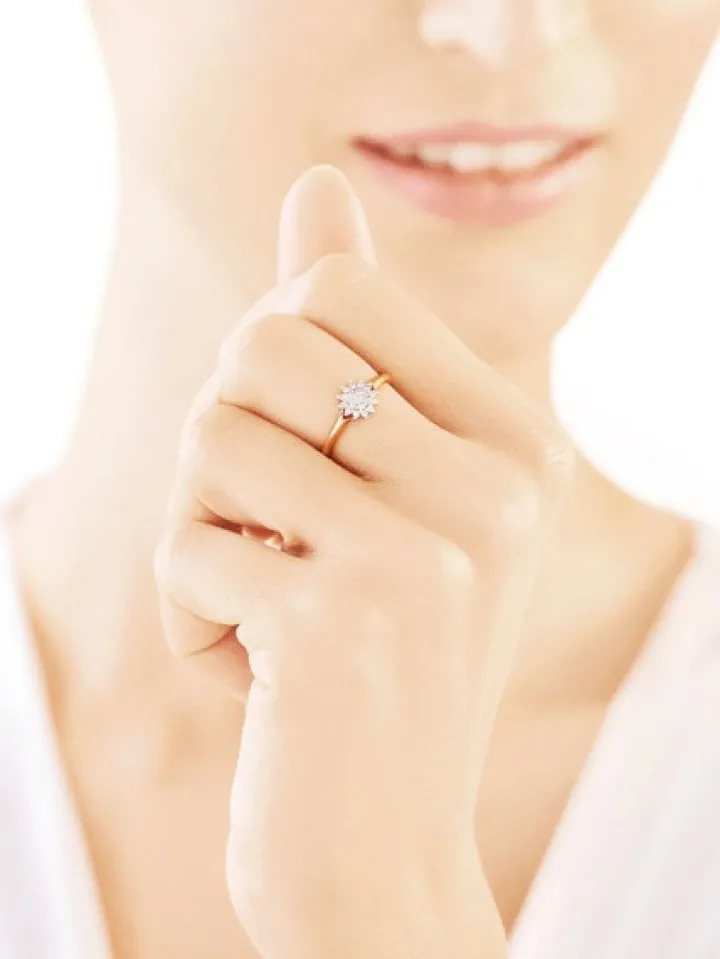 Chwila zaręczyn przypieczętowana diamentowym blaskiem. Wyjątkowy pierścionek zaręczynowy z żółtego i białego złota, który czaruje nie tylko brylantowym blaskiem, ale także finezyjnym projektem, nawiązującym do nostalgicznego piękna stylu retro. 19 brylantów, harmonijnie skomponowanych w kolisty kształt, tworzy spektakularny, ozdobny detal.