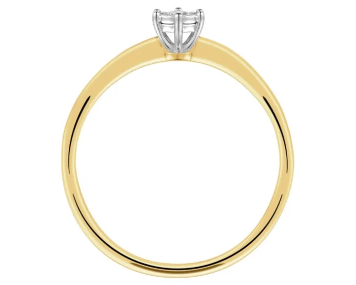 Klasyczny pierścionek zaręczynowy z brylantem. Ponadczasowy blask brylantu ujęty w subtelną formę pierścionka to idealny wzór zaręczynowy. Pierścionek zaręczynowy wykonano z żółtego złota, a elementy oprawy brylantu, w tym fasetowaną otoczkę, która optycznie powiększa kamień z białego złota. Subtelny i pełen blasku wzór idealnie podkreśli romantyczny charakter chwili zaręczyn.