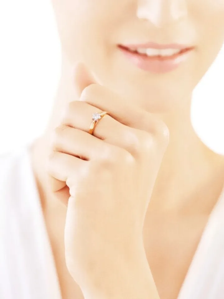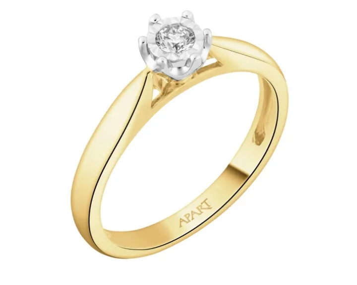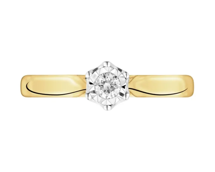 Chwila zaręczyn przypieczętowana diamentowym blaskiem. Szykowna prostota pierścionka z żółtego złota eksponuje brylant, oprawiony w sześć krap, którego blask zyskał intensywność dzięki fasetowanej otoczce z białego złota, optycznie powiększającej kamień.