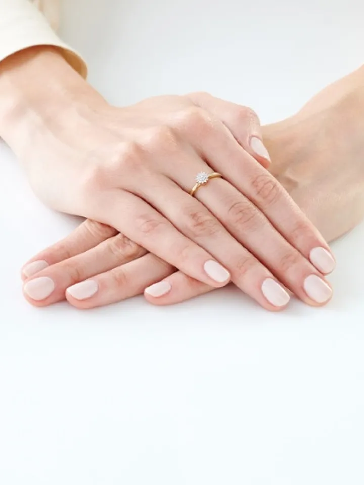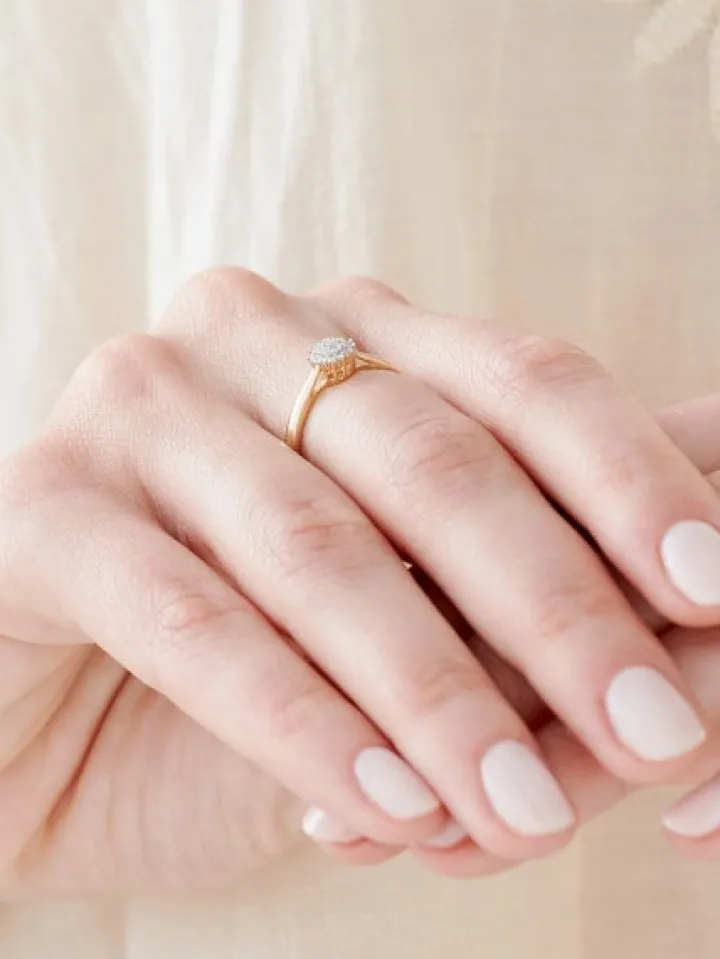 Chwila zaręczyn przypieczętowana zwielokrotnionym blaskiem diamentów. Aż dziewiętnaście maleńkich kamieni o brylantowym szlifie tworzy misterną rozetę, która zdobi szykowny pierścionek. Perfekcyjna kompozycja, dystynkcja i nieprzemijająca uroda złota, czynią z niego doskonały, zaręczynowy symbol.