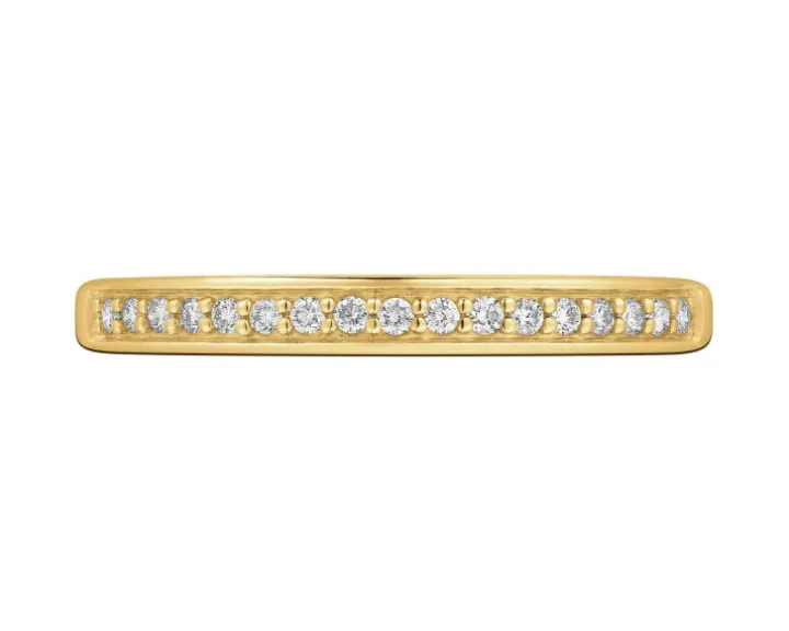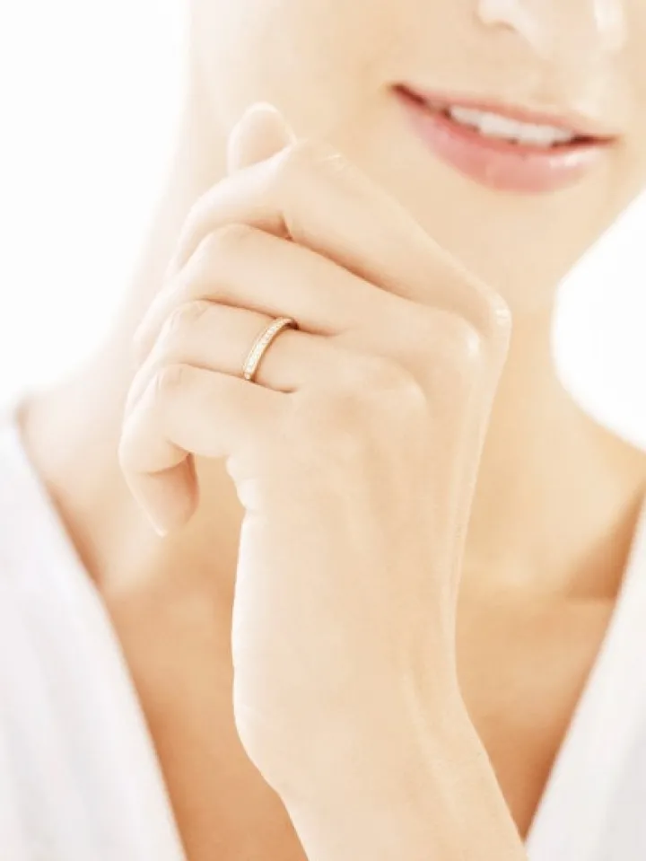 Ozdobiony brylantami minimalistyczny pierścionek z żółtego złota próby 585. Dyskretny styl obrączkowego wzoru przełamuje oprawiona z wielkim kunsztem kompozycja 17 brylantów o łącznej masie 0,10 ct. Założony, złoty pierścionek z brylantowym blaskiem będzie prawdziwą ozdobą kobiecej dłoni, łącząc w sobie szlachetną prostotę formy z najbardziej pożądanymi kamieniami. Nowoczesny pierścionek doskonale prezentuje się zwłaszcza noszony jednocześnie z identycznymi pierścionkami z białego i różowego złota, ale równie pięknie wygląda jako samodzielny dodatek. Można go także nosić z wieloma innymi pierścionkami, na przykład z sygnetami, tworząc autorskie zestawy, zainspirowane aktualnymi trendami. Pierścionek występuje także w wersji wykonanej z żółtego złota próby 750.