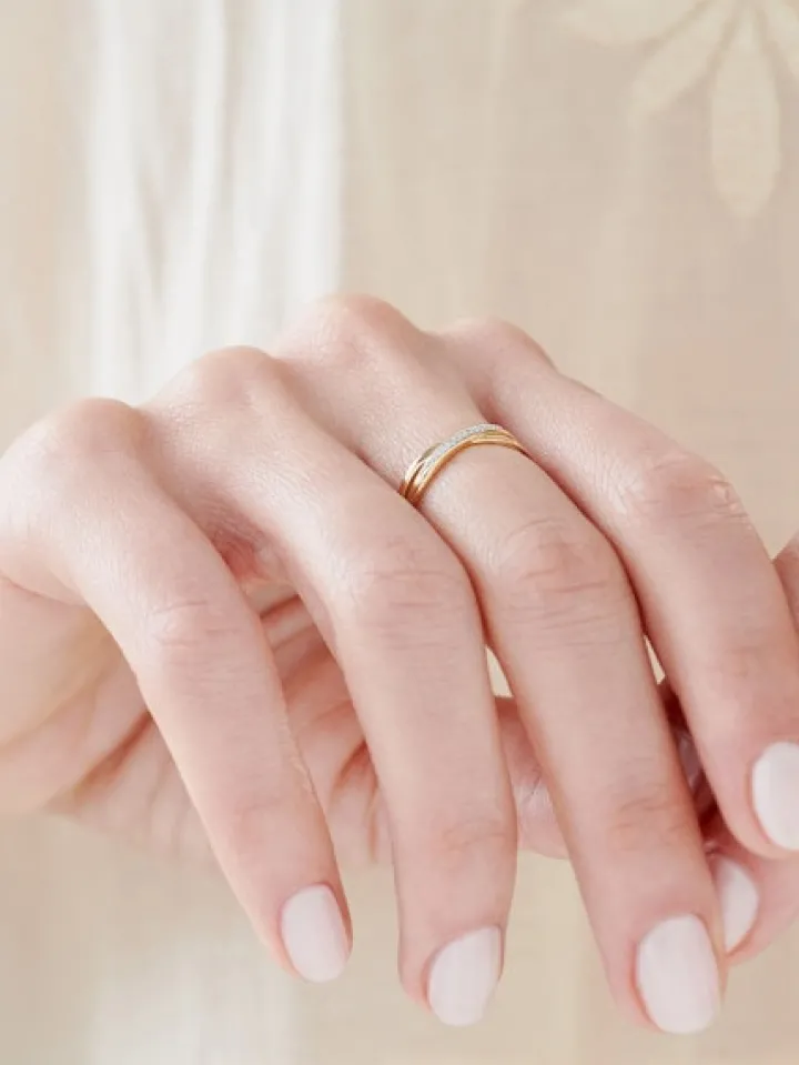 Nowoczesny złoty pierścionek z diamentami. Minimalistyczną formę pierścionka z żółtego złota przełamuje blask misternie oprawionych diamentów, które rozświetlają element dekoracyjny pierścionka w formie przenikających się elementów o łagodnych liniach. Idealny pierścionek dla wielbicielki dyskretnego stylu w biżuterii i lśnienia diamentów.