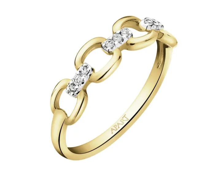 Modny, a przy tym efektowny złoty pierścionek z diamentami. Wzór z żółtego złota próby 375 ozdobiono motywem splotu łańcucha, który rozświetla 9 diamentów o łącznej masie 0,05 ct. Pierścionek z diamentami skradnie serce kobiet, które poszukują biżuterii z tymi kamieniami w mniej klasycznym wydaniu. Jest idealnym dodatkiem dla podążających za aktualnymi trendami modowymi. Wzór można nosić jako samodzielny dodatek, ale doskonale będzie się prezentował łączony z innymi pierścionkami, na przykład złotymi sygnetami. Diamentowy pierścionek o nietuzinkowym designie wybiorą te z pań, które lubią stylizacje z nutą ekstrawagancji, podkreślone niebanalną biżuterią.