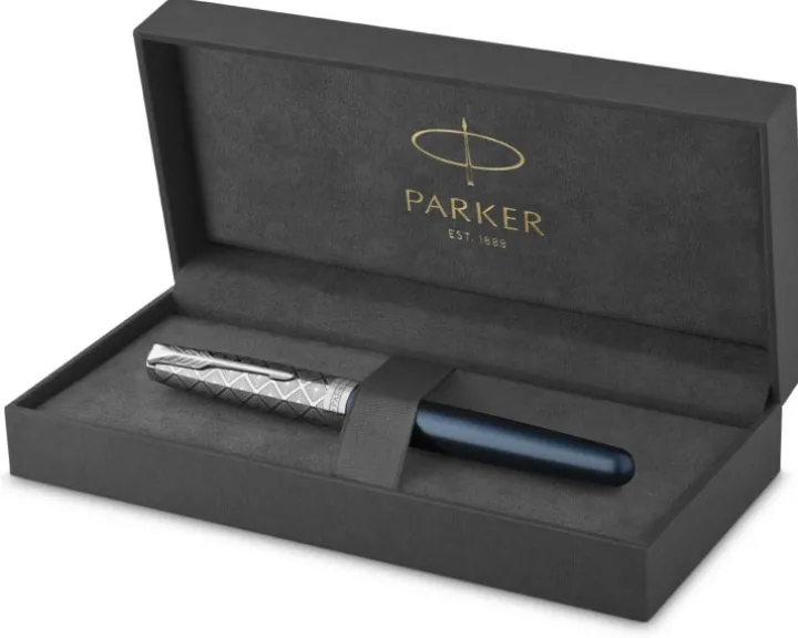 Sonnet Metal & Blue to klasyczna odsłona wysublimowanego stylu i elegancji. Satynowy lakier w odcieniu błękitu dopełniają palladowe detale i stalówka z 18-karatowego litego złota wykończona rodem. Wytrawiane na nasadce misterne zdobienia w romby dodadzą pisaniu wyrafinowania.