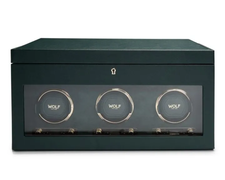 Rotomat o wymiarach 45,09 x 19,69 x 24,77 cm. Przeznaczony dla trzech zegarków. Posiada dodatkowe miejsca na przechowywanie oraz etui podróżne. Wykonany ze skóry wegańskiej.
