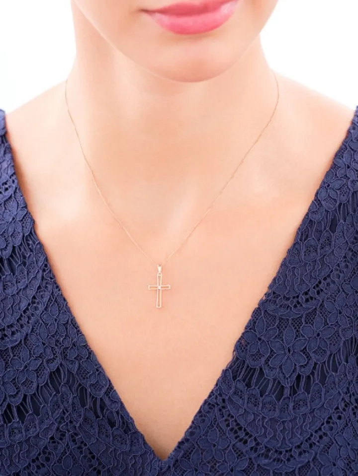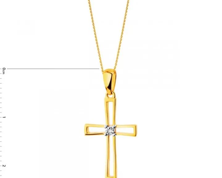Nietuzinkowa ażurowa zawieszka, w której centralnym miejscu znajduje się iskrzący blaskiem diament o masie 0,002 ct. Zestawienie fasetowanej otoczki diamentu i czterech krap z białego złota oraz żółtego kruszcu zamkniętego w formie krzyżyka wywiera niezwykłe wrażenie estetyczne i zachwyca kunsztem wykonania.