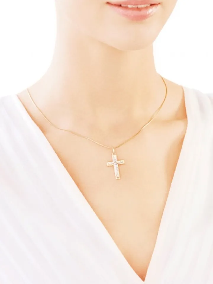 Okazała złota zawieszka w kształcie klasycznego łacińskiego krzyża pasyjnego, w którym przejmujący obraz ukrzyżowania został wyeksponowany przez połączenie dwóch kolorów kruszcu: krzyż wykonano z żółtego złota, natomiast napis INRI i postać Chrystusa – niezwykle wyrazistą w tym zestawieniu – ze złota rodowanego. Zawieszka o dużym ładunku emocjonalnym i znaczeniu symbolicznym dla osób wierzących.