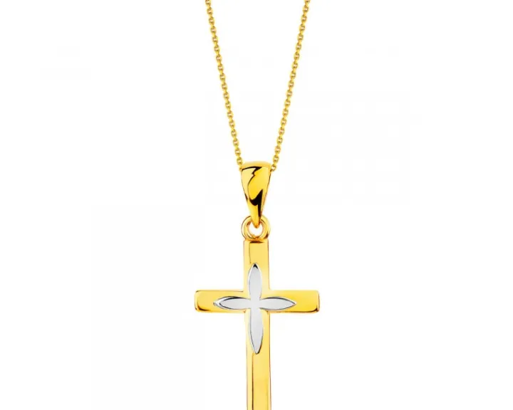 Zawieszka z 14-karatowego złota w kształcie klasycznego łacińskiego krzyża, w który wpisany jest równoramienny krzyż z żółtego złota rodowanego. Harmonijne połączenie klasycznych figur ujęte w szlachetnym kruszcu olśniewa blaskiem i zachwyca sugestywnością kompozycji.
