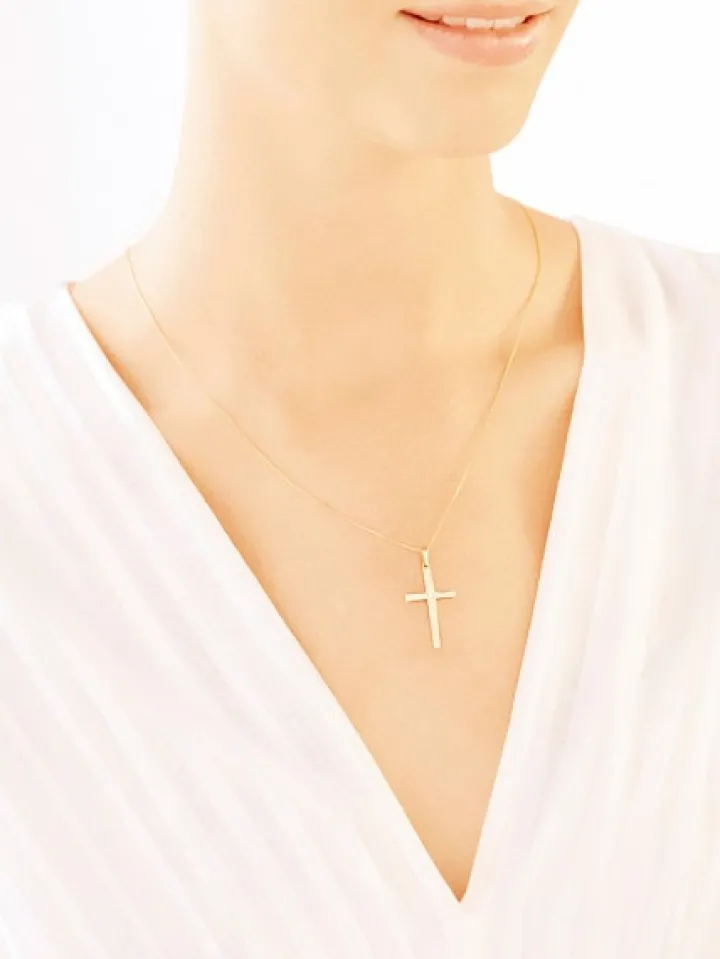 Ponad trzycentymetrowy złoty krzyżyk o klasycznym kształcie, którego ascetyczne piękno, ukryte w prostych liniach, zostało wzbogacone migoczącą blaskiem cyrkonią, umieszczoną w miejscu przecięcia się ramion krzyża. Wyjątkowy prezent dla bliskiej osoby z wielu różnych okazji.