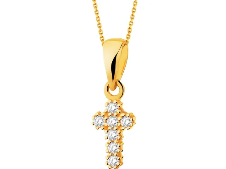 Biżuteryjna złota zawieszka w kształcie krzyża, mieniąca się blaskiem siedmiu cyrkonii, z których każda otoczona jest ośmioma krapami z 8-karatowego złota. Miniaturowy klejnot dla bliskiej osoby.
