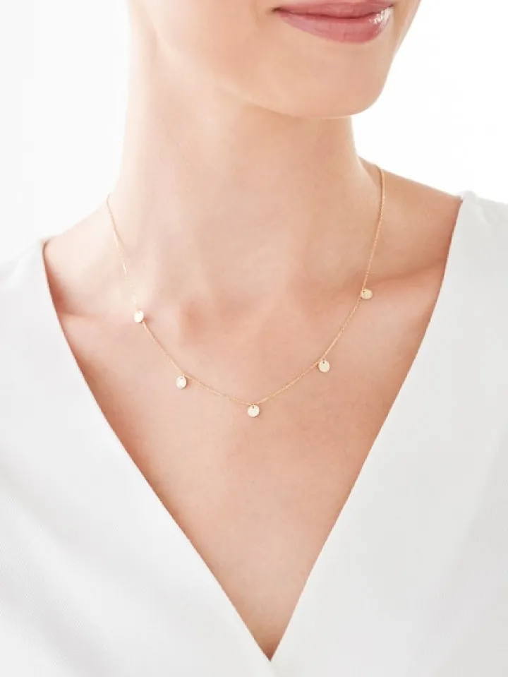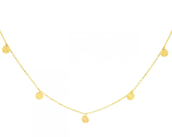 Złoty naszyjnik z delikatnym łańcuszkiem ozdobionym filigranowymi okrągłymi zawieszkami. Koliste detale pokryto nieregularną fakturą, dzięki czemu złoto wydaje się być bardziej wielowymiarowe, a jego refleksy nabrały intensywności. Naszyjnik to piękny, uniwersalny dodatek do wielu stylizacji.