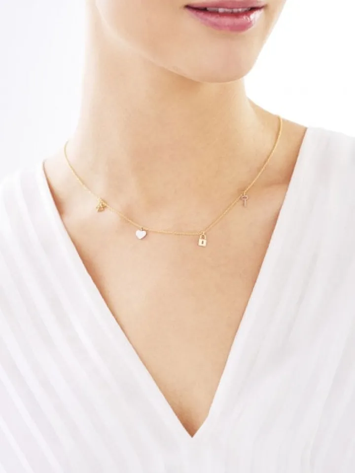 Złoty naszyjnik – aniołek, serce, kłódka, kluczyk