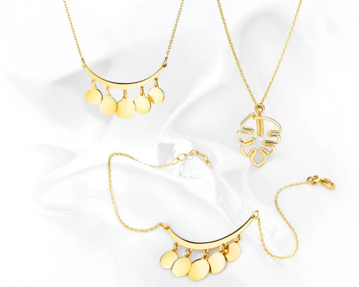 Złoty naszyjnik z dekoracyjną zawieszką w kształcie ażurowego liścia. Odwołujący się do piękna natury wzór wspaniale będzie współgrał z różnymi stylizacjami, zwłaszcza w połączeniu z pasującymi do kompletu kolczykami i bransoletką.