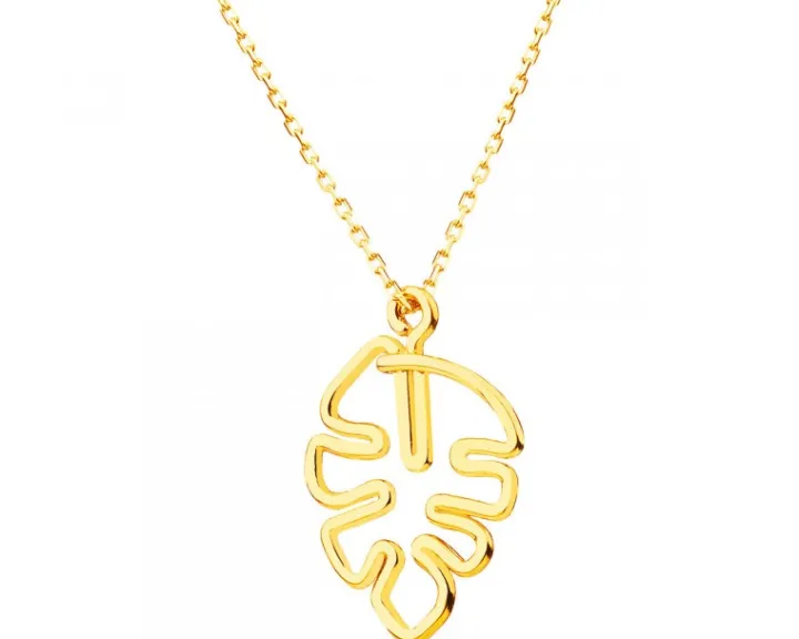 Złoty naszyjnik z dekoracyjną zawieszką w kształcie ażurowego liścia. Odwołujący się do piękna natury wzór wspaniale będzie współgrał z różnymi stylizacjami, zwłaszcza w połączeniu z pasującymi do kompletu kolczykami i bransoletką.
