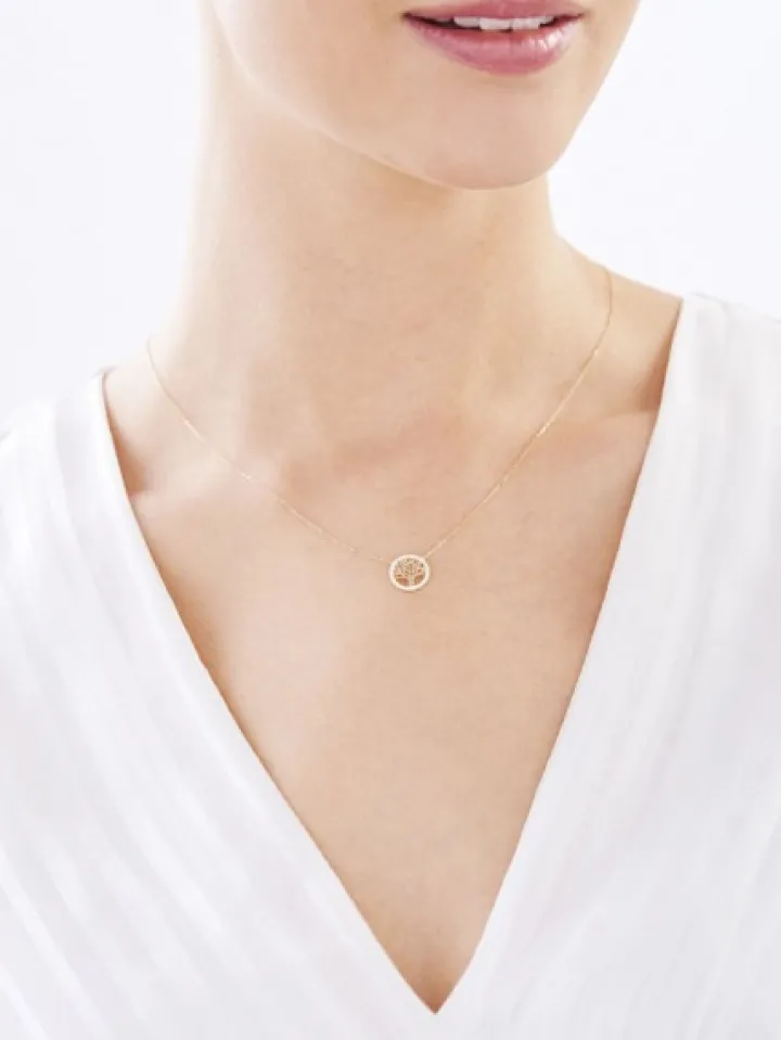 Złoty naszyjnik z blaskiem cyrkonii dedykowany miłośniczkom piękna natury. Naszyjnik z żółtego złota, podobnie jak pasującą do niego bransoletkę, ozdobiono motywem w kształcie drzewa, zamkniętego w delikatną kolistą formę. Subtelny dekoracyjny detal podkreślono dodatkowo kompozycją kunsztownie oprawionych cyrkonii.
