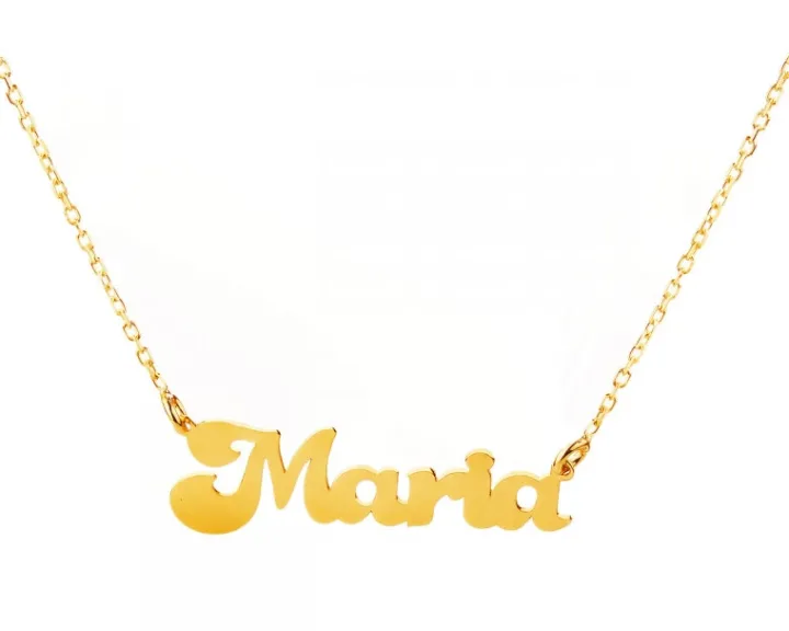 Eteryczny naszyjnik z żółtego złota z imieniem Maria. Piękny podarunek dla dziewczynek i kobiet o tym szlachetnym imieniu, który sprawdzi się przy każdej, nawet wyjątkowej okazji. Imieniem z delikatnych liter ze złota ozdobiono zawieszkę naszyjnika, a jego forma sprawia, że idealnie przylega i subtelnie zdobi dekolt.