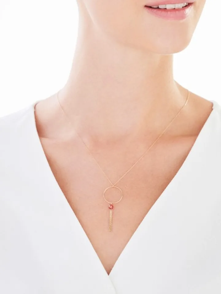 Ozdobiony barwną cyrkonią naszyjnik z żółtego złota. Złoty naszyjnik wyróżnia się delikatną formą oraz zwracającą uwagę zawieszką, będącą połączeniem eterycznego kółka, cyrkonii w intensywnym kolorze oraz subtelnej kompozycji swobodnie opadających łańcuszków. Wzór łączy się w komplet z kolczykami z kolekcji.