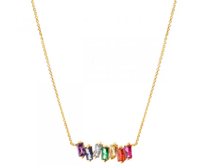 Złoty, skąpany w wielobarwnych refleksach naszyjnik w oryginalnym stylu. Zniewalające kolory cyrkonii o wykwintnym szlifie bagieta decydują o tym, że mimo delikatnej formy, po założeniu ten naszyjnik z żółtego złota będzie niesamowicie przyciągał uwagę nasyconą kolorystyką olśniewającej kompozycji. Naszyjnik szczególnie pięknie będzie się prezentował w komplecie z pierścionkiem i kolczykami.