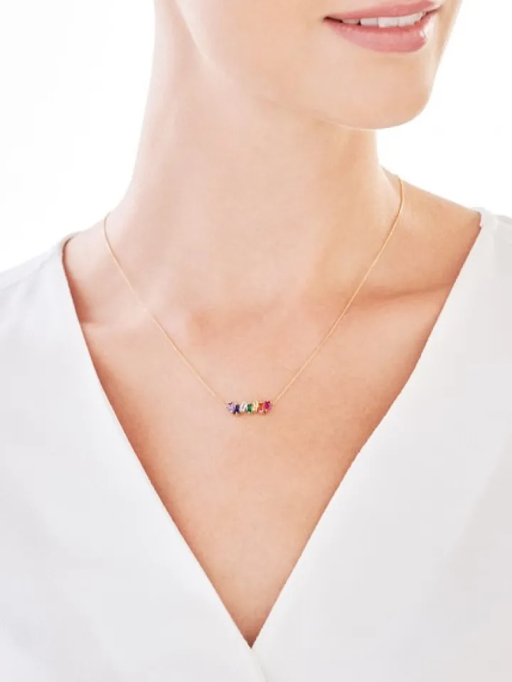 Naszyjnik Apart wykonano z żółtego złota próby 375 oraz kompozycji wielobarwnych cyrkonii o szlifie bagieta. Złota biżuteria wyróżnia się cudowną barwą, która zachowuje swój urok przez wiele lat użytkowania. Naszyjnik dostępny jest w rozmiarze 39 cm oraz 40 cm długości, którą dzięki specjalnej przedłużce można komfortowo dopasować do własnych potrzeb. Kompozycja kolorowych cyrkonii mierzy 17 mm długości i 6 mm szerokości.