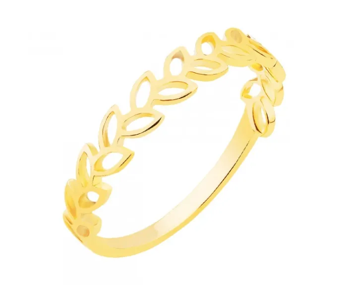 Nawiązujący do kształtu wieńca laurowego złoty pierścionek. Delikatne ażurowe elementy przypominające kształt liścia oplatają kobiecy palec subtelną kompozycją z żółtego złota. Eteryczny wzór spodoba się wielbicielkom modnych nawiązań do świata natury w biżuterii.