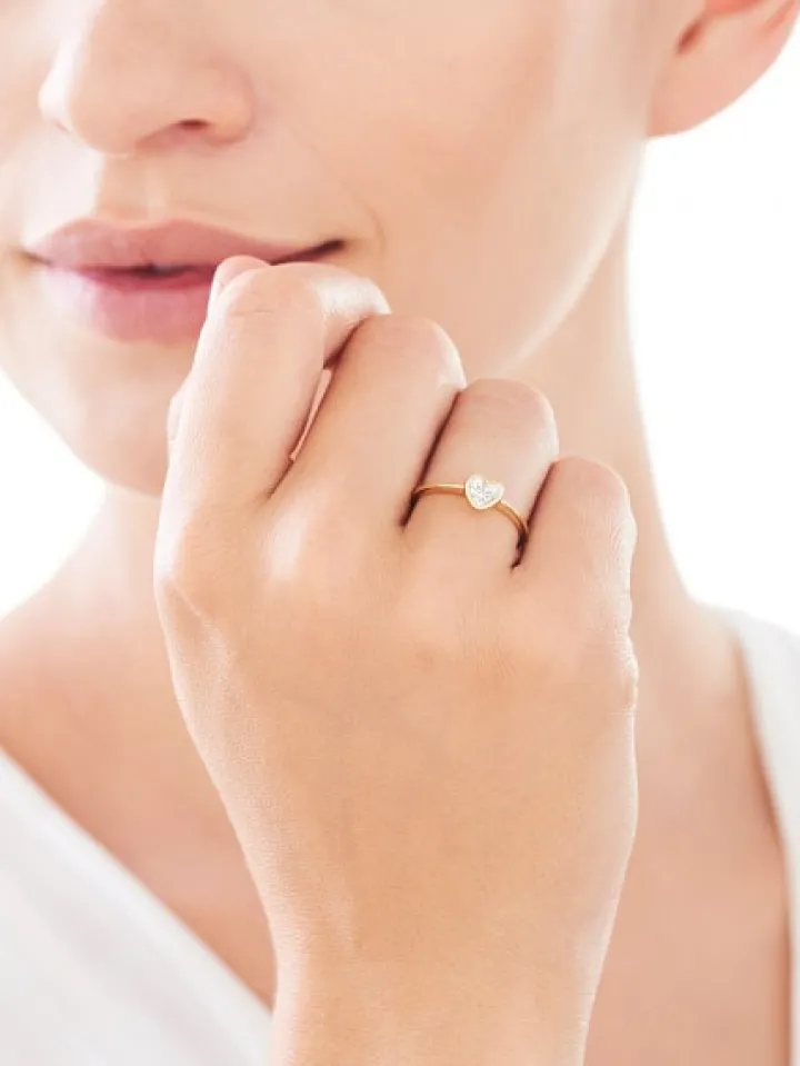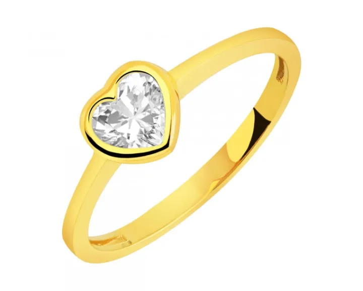 Złoty pierścionek w romantycznym stylu z wyjątkowym efektem lśnienia białej cyrkonii. Zamknięty w ramy żółtego złota kamień przybrał kształt rozświetlonego blaskiem serca. Dziewczęcy urok pierścionka sprawia, że doskonale sprawdzi się jako upominek.