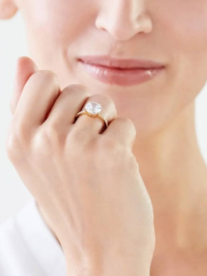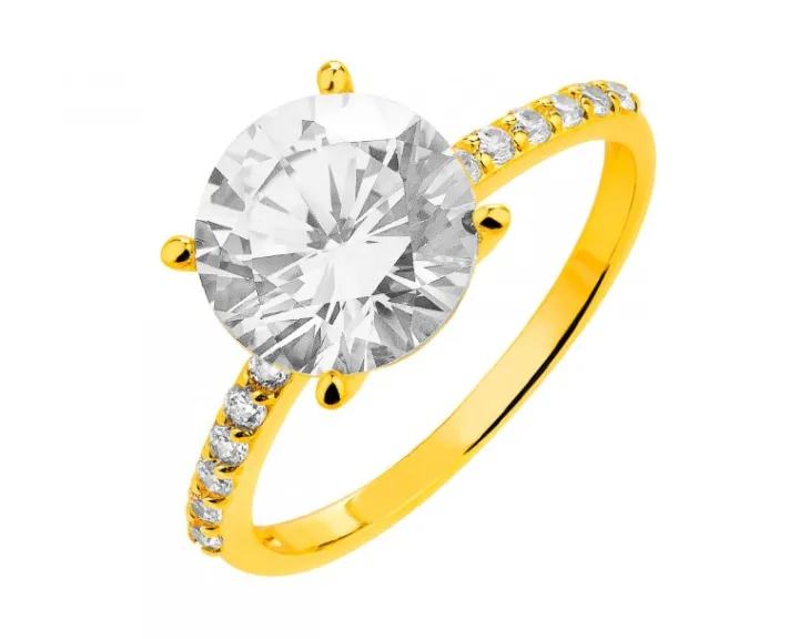 Pierścionek wykonano z żółtego złota próby 333 i ozdobiono cyrkoniami.
