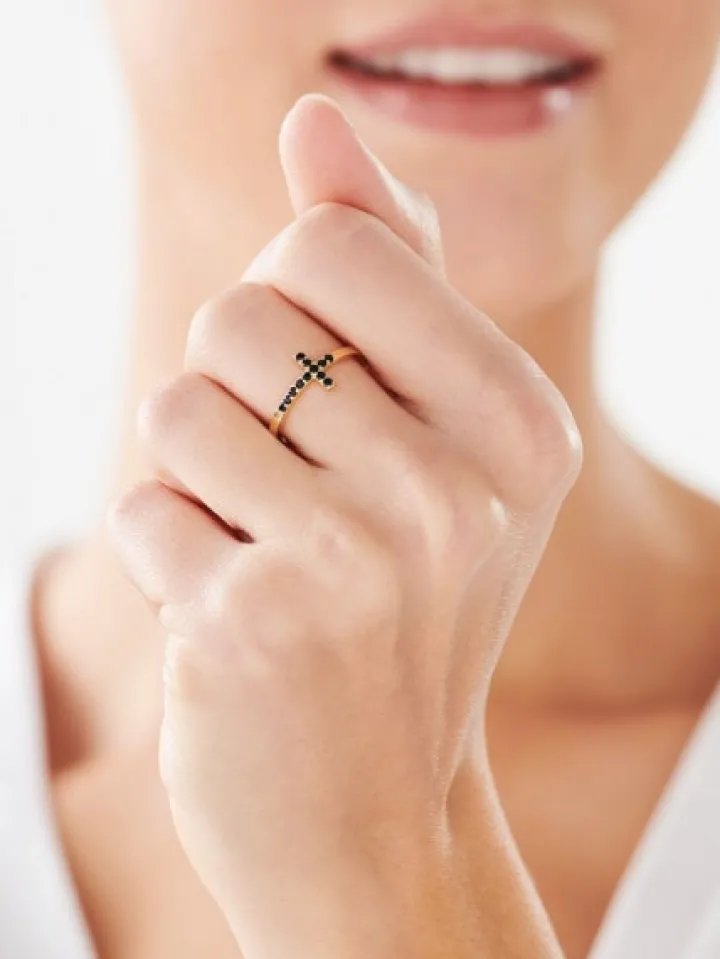 Połyskujący czarnymi cyrkoniami złoty pierścionek z motywem krzyżyka. Odważny styl i kontrastująca z formą czerń kompozycji cyrkonii sprawiają, że pierścionek prezentuje się ekspresyjnie i spodoba się kobietom poszukującym bardziej oryginalnych, dalekich od klasyki wzorów.